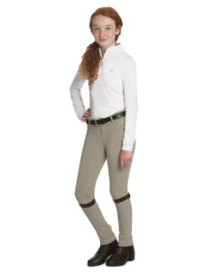 Ovation boys horse riding breeches have a front zip, two pockets in front, and two flap pockets in back. These super comfortable and durable Softflex 4-Pocket knee patch breeches for boys are ideal for lessons, everyday riding, and showing. The affordable low price makes them a great choice for kids that are just starting to show as well as experienced competitors who need several pairs of breeches. The Ovation Boys Softflex 4-Pocket Breech is available in Grey and Neutral Beige