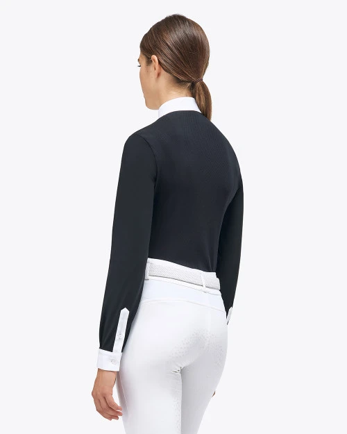 Cavalleria Toscana REVO Pleated Bib Show Shirt with long sleeves is super clean and crisp with all the modern technology and design for comfort and show arena style. The black long sleeve equestrian show shirt for women is a lightweight stretch jersey with amazing REVO technical knit in the back. The ventilation is superb for summer horse showing. A white poplin bib, show collar, and cuffs keep the look classic.