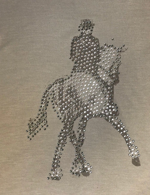 Women’s long sleeve casual equestrian top from Chestnut Bay has crystals that form a dressage horse and rider team. The effect is a little glitzy but not bit-time blingy. The solid color of the shirt, simple lines, and overall elegance combine for a balanced and sophisticated look. Chestnut Bay Crystal Dressage Top is perfect for times when you want to look cute and stylish but feel like you’re dressed in your softest, coziest pajamas. It’s a great choice for holiday parties at the barn or at home.