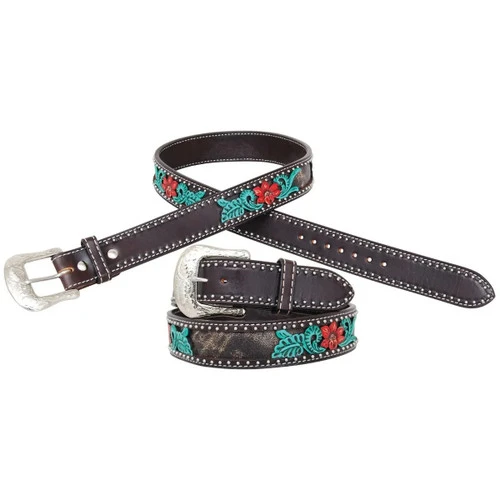 Cactus Flower Filigree Belt From Circle Y is the perfect Western belt to make an outfit complete. The lovely hand painted cactus flower design in green and red really pops against the chocolate leather with distressed finish.