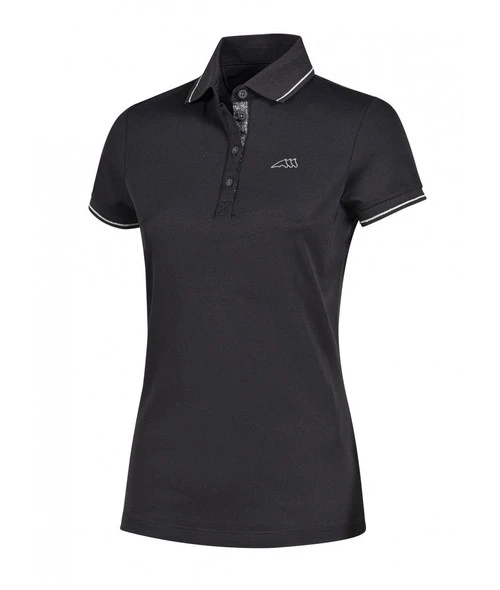 Women’s Equiline GretiG Tech Polo has gorgeous subtle glam details plus a technical pique knit fabric that is soft and breathable for summer comfort. GretiG ladies horse riding polo shirt in black knit has silver lurex lining the button placket, a silver Equiline horse heads logo at the chest, and a narrow silver stripe accenting the cuffs and collar. So elegant!