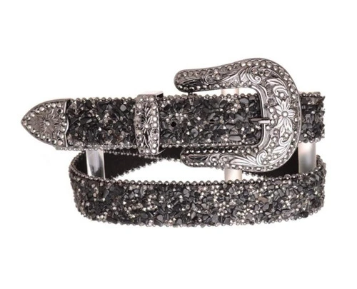 Kamberley Stone Overlay Leather Belt in Turquoise or Black has small polished stones completely covering the leather, creating dramatic impact. Truly stunning, the Stone Overlay Leather Belt is finished with a fancy Western buckle set accented with rhinestones. The underside of the belt is soft suede.