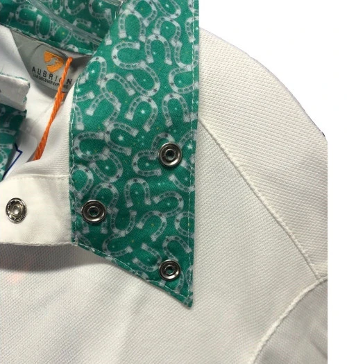Kids Aubrion Equestrian Long Sleeve Show Shirt is perfectly traditional while giving young riders all the modern comfort they need for showing. The girls’ long sleeve white show shirt has a hidden snap quarter placket and wrap show collar. The snap wrap collar and cuffs are lined with a green lucky Horse Shoes print fabric. The lightweight Aubrion Equestrian Show Shirt looks crisp and feels great!
