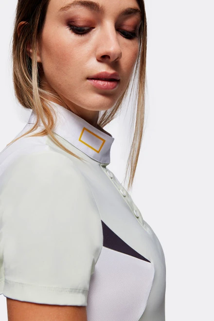 Women’s RG Jersey Short Sleeve Button Competition Polo is silky smooth with highly breathable mesh back and side inserts. The fresh and fun competition polo has a white poplin show collar with hidden snap closures and a three-button placket. RG Rider’s Gene from Cavalleria Toscana offers cutting edge style with quality.