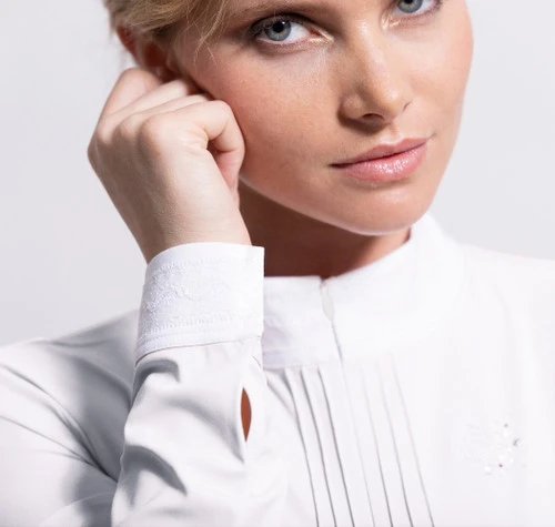 Samshield Camille Long Sleeve Show Shirt will be a very special part of your show wardrobe thanks to its exceptional style and ability to perform. The women’s long sleeve English horse show shirt has a lovely show collar with white lace overlay and matching cuffs. The pin tuck pleated front has the most well-concealed zipper imaginable that gives the shirt a very clean, neat look.